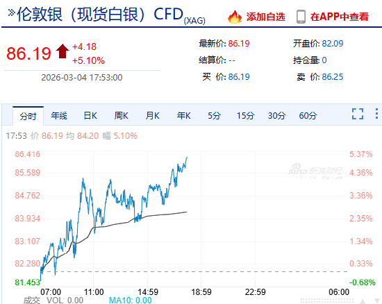 北京时间3月4日下午,现货白银日内大涨超5%,联华证券,联华证券配资,香港联华证券公司现报86.19美元/盎司。